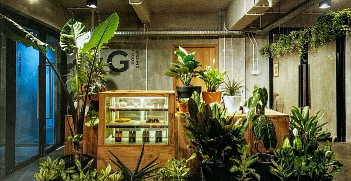 Di bagian bawah, tanaman-tanaman dalam pot besar berbaris menutupi bagian muka dengan bukaan di depan pintu kaca yang terletak di tengah. Pada langit-langitnya, pot-pot kecil tergantung membentuk garis lurus dengan daun-daun yang menjulur ke bawah. Begitu pun teras di lantai-lantai berikutnya yang terlihat dari depan. Daun-daun berwarna hijau menyeruak seakan ingin bersenda gurau dengan angin semilir di depannya. Sementara dinding bangunan ini dibiarkan telanjang tanpa cat